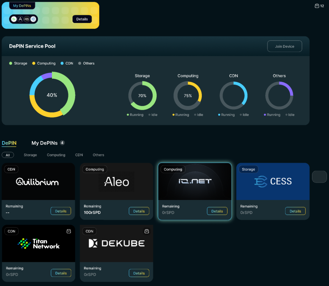#### The DePIN section aims to integrate early-stage testnet public chain projects, built on Solana and FEVM networks (paused). Investors participate by using rSPD, and upon mainnet launch, they receive additional rewards. All rSPD used for participation will be burned.